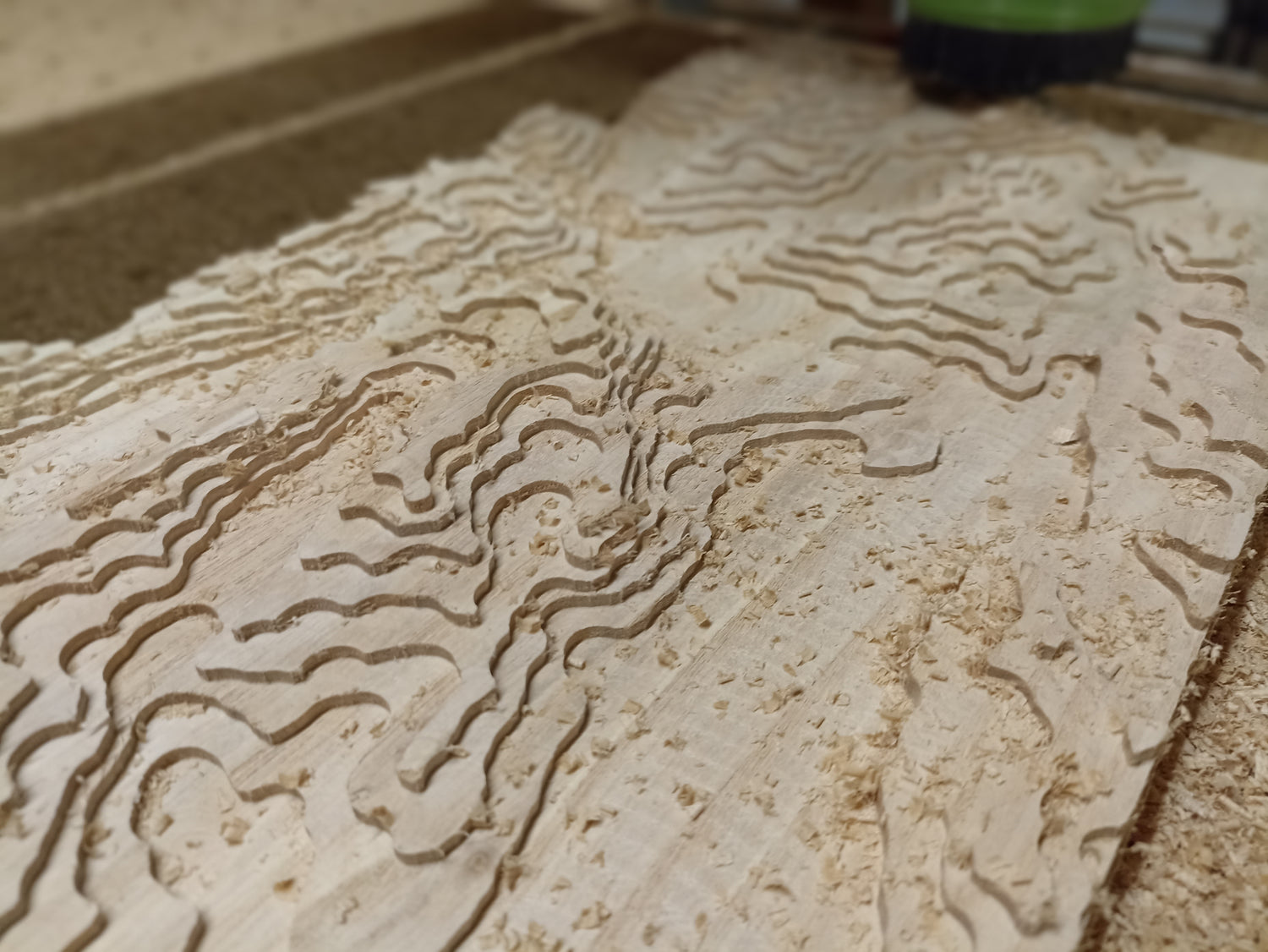 Unsere Karten sollen nicht nur als Kunst dienen, sondern erheben auch den Anspruch geografischer Richtigkeit. Die digitalen Höhenmodelle werden aus Daten der NASA gewonnen und weiterverarbeitet. Für die Projektion und der damit einhergehenden Flächentreue wird je nach Lage die korrekte UTM Projektion verwendet. Auf Grundlage der so gewonnenen Stl Dateien, wird der CNC Fräse die Feinarbeit überlassen. Dabei werden in mehreren Arbeitsschritten, mit verschieden Fräswerkzeugen, die Hölzer bearbeitet, bis wir uns von der vollendeten Präzisionen begeistern lassen können.