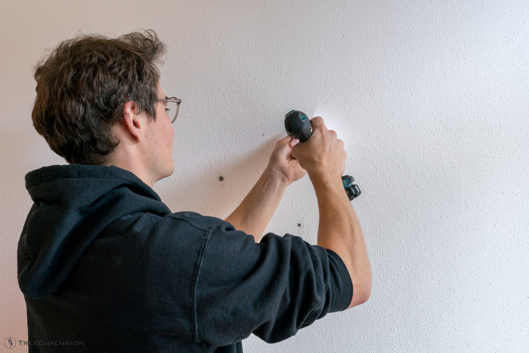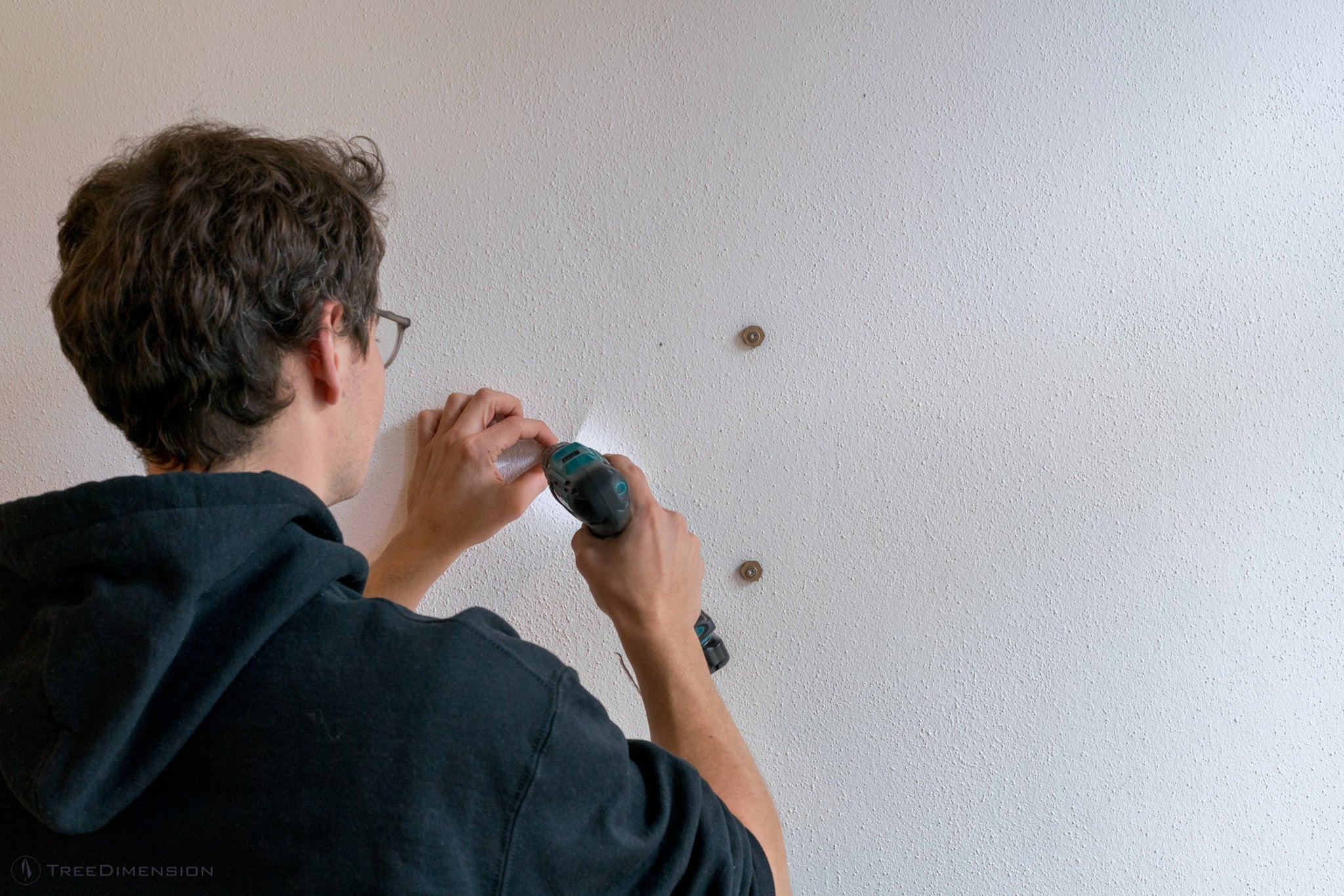 - An den zuvor an die Wand übertragenen Mittelpunkten müssen nun mit einer Bohrmaschine und einem 5mm Bohrer die Löcher für die Dübel gebohrt werden.