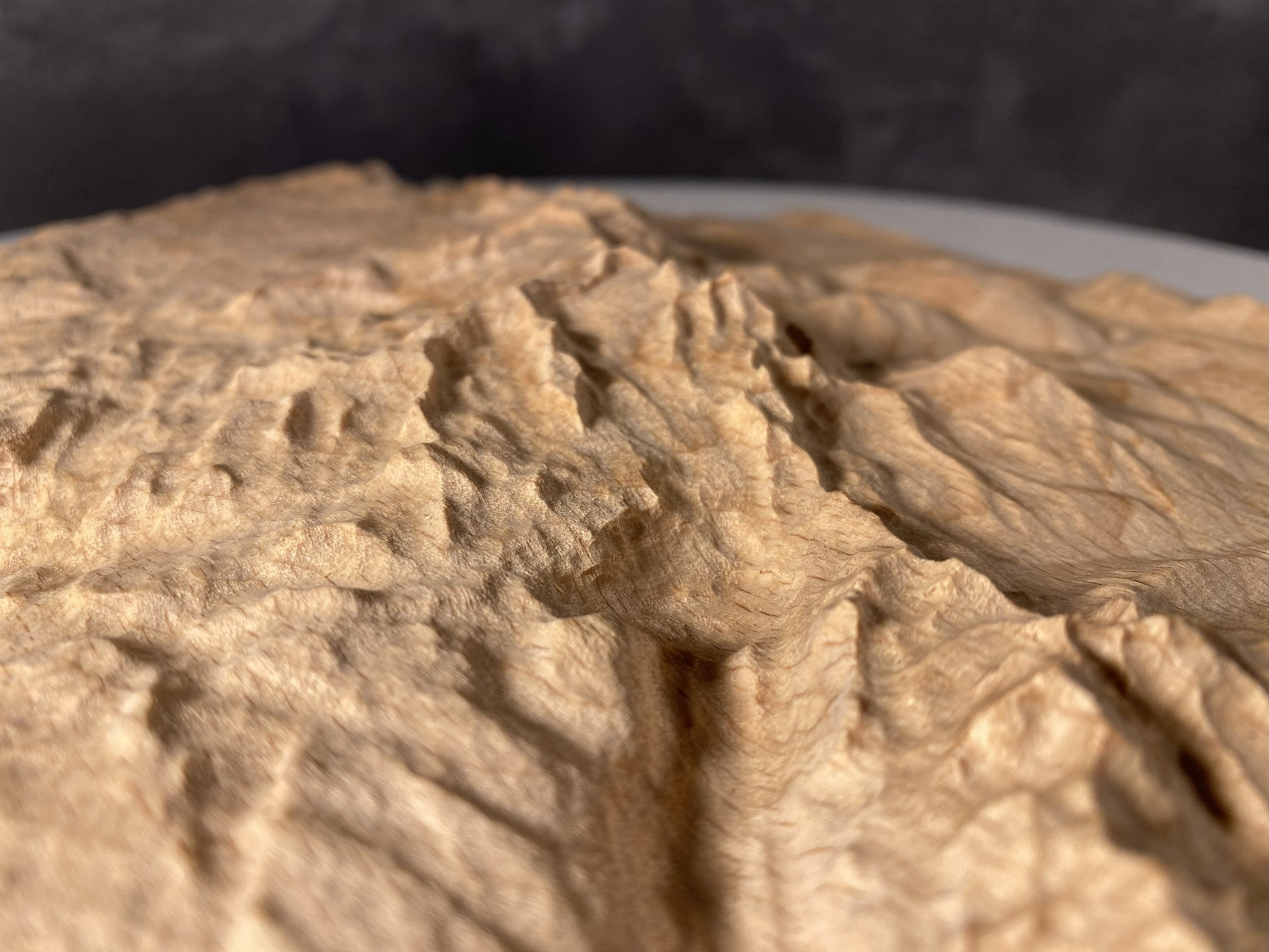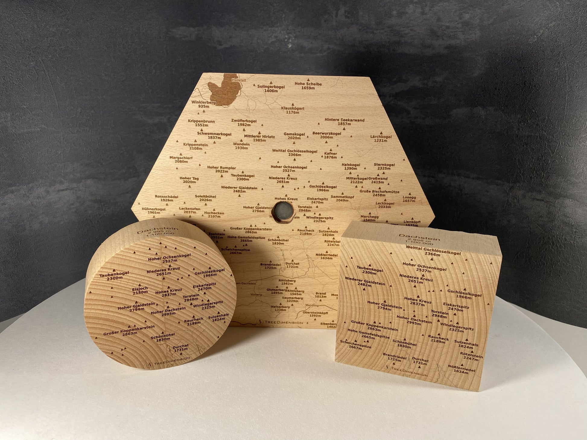 Gefertigt aus Buchenholz, im Maßstab 1:100.000, mit Lasergravur der umliegenden Landschaft auf der Rückseite.